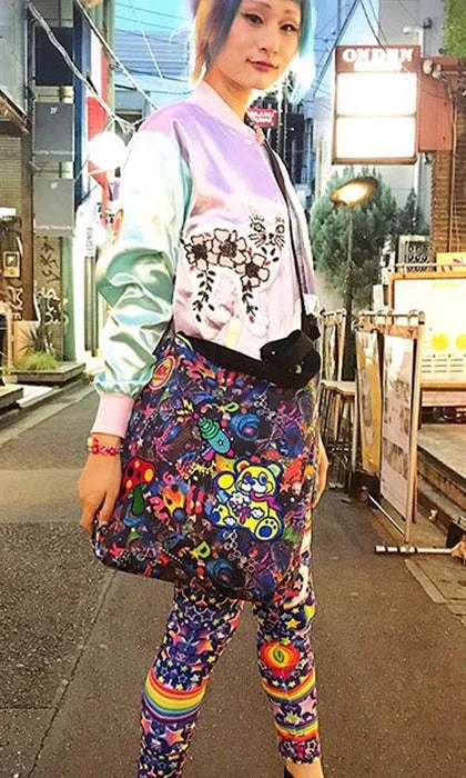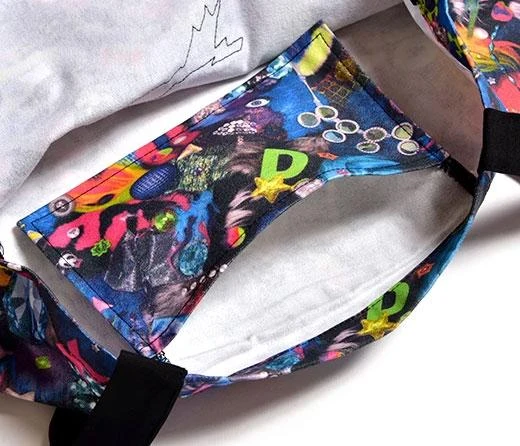 A 2-way shoulder bag made of the original Neon Spectrum print that features neon colors and printed gem studs. It’s also decorated with original, pop-art style patches for a super cute look. Adding a colorful pattern to an outfit is always a good mood booster! You can carry it not only on your shoulder, but as a tote bag too with the shorter handles. Inside is a convenient small pocket to hold your keys, smartphone, or other small necessities.