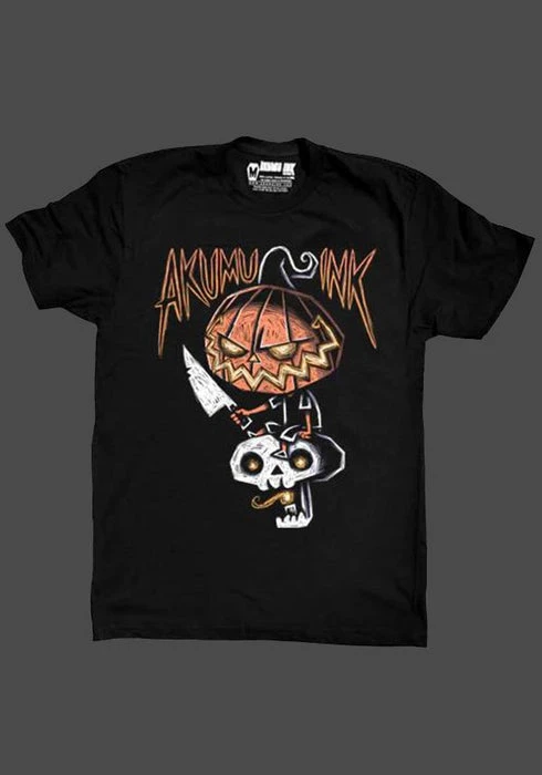 Original hand-drawn artwork of a mischievous pumpkin sitting on a skull.