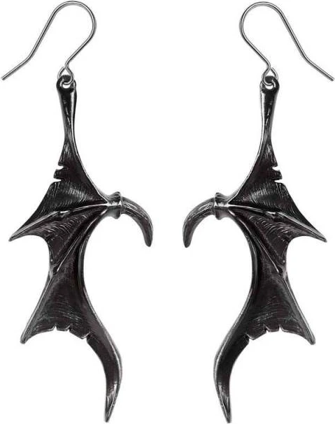 Two black pewter earrings of symmetrically opposite dragon wings on surgical steel ear-wires.