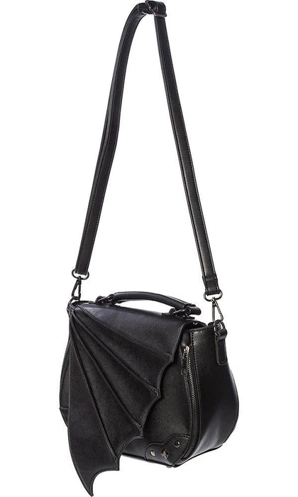 A small handle and an optional adjustable shoulder strap give you the option to wear in a number of ways. With a batwing design flap and front and side zips, this bag is as elegant as it is spooky.