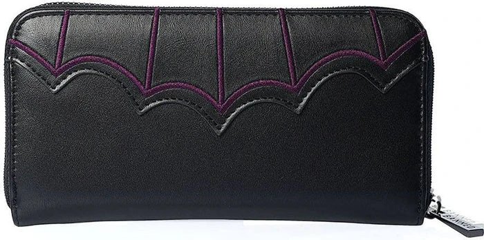 Bat’s all, folks! A colony of bats flies across this black wallet with a scalloped batwing top panel.