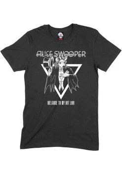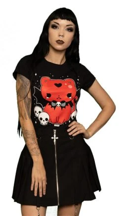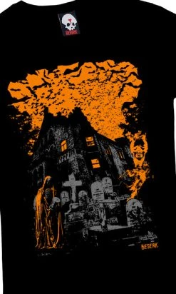 This fierce Tee features a creepy haunted house with a swarm of bats, perfect for your dark wardrobe!