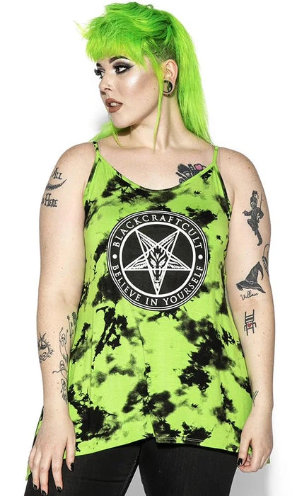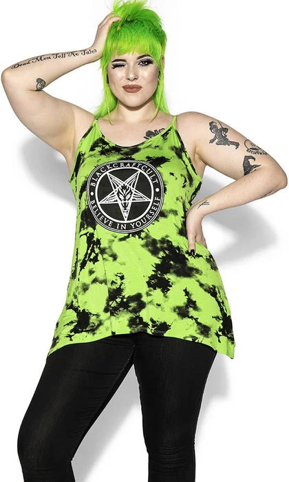Create your own future! The Believe In Yourself Green Lightning Dye Tank Top by Blackcraft is ultra soft and features one of Blackcraft’s many logos – Baphomet in contrasting white print, on a green and black tie-dye background. Blackcraft tops are super comfortable, and true to size.