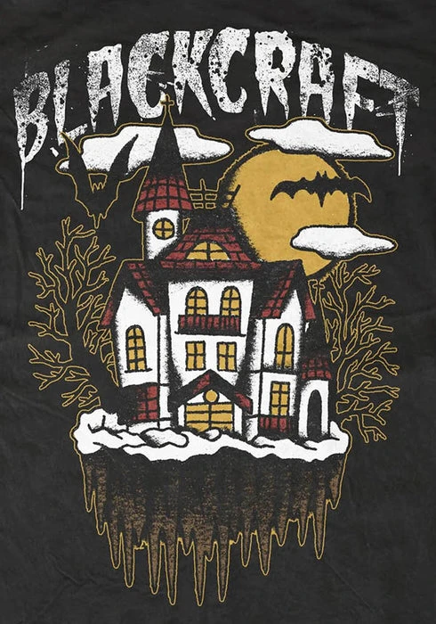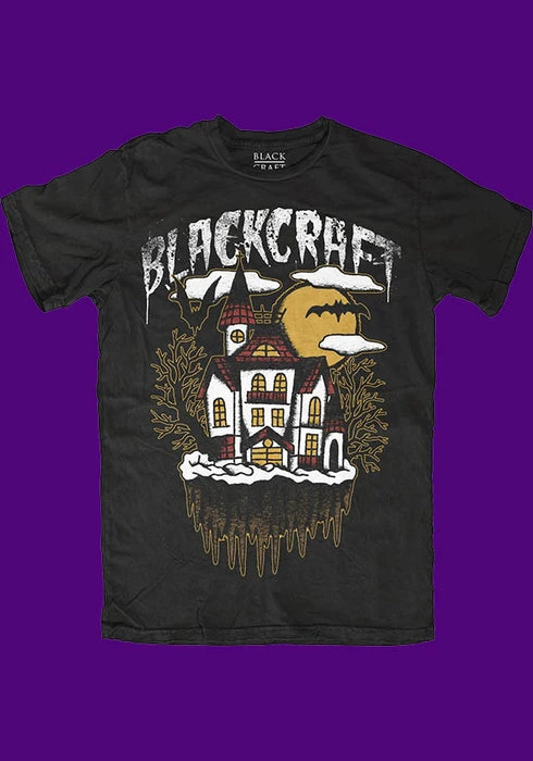 This comfortable shirt features a spooky, haunted house on the front and large text on the back.