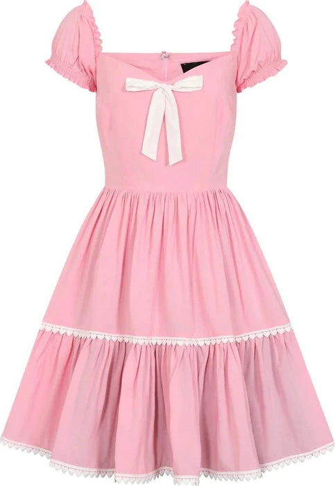 Hey there, doll face! Made from a cheery pink viscose fabric, the fitted bodice has a flattering sweetheart neck with an adorable contrasting white bow. The short puffy sleeves can be worn either on or off the shoulder, and the skirt is intended to be approximately mid-thigh. This skirt features a ruffled seam of dinky white hearts, matching the hem, and we wouldn’t dream of not including pockets! Fastens with covered zip running down the middle of the back.