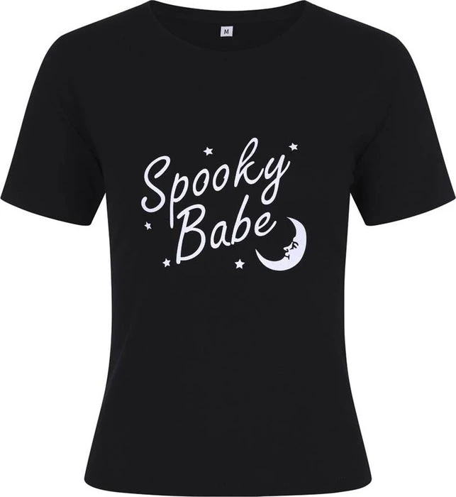 Calling all goth ghouls! You’ll be bewitched by the Spooky Babe t-shirt. It’s a classic hip length, black cotton round neck t-shirt with a bespoke spooky Babe design in a charming white font, surrounded by stars and a smiling crescent moon. Pair it with a biker jacket and spooky oversized statement earrings. With a fab fitted shape, it looks great with a swing skirt or your favourite high-waisted jeans.