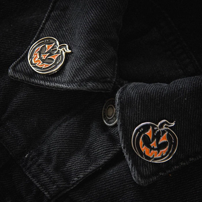 This Halloween enamel pin set features a matching set of jack-o-lanterns in silver, black, and orange. Wear them on the collar points of your favorite jacket for instant spooky style!