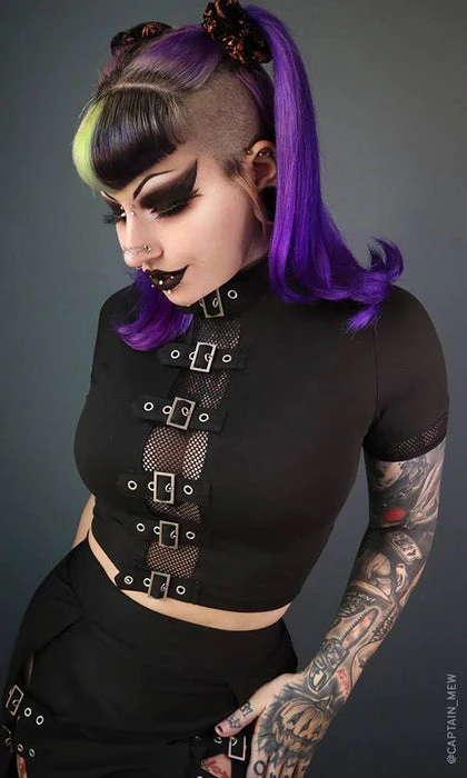 The Winona top features buckle details throughout with a mesh cut out down the middle. Soft stretch fabric throughout and breathe-able mesh. Who said being glamorous had to be uncomfortable?