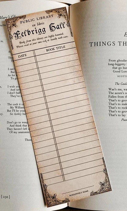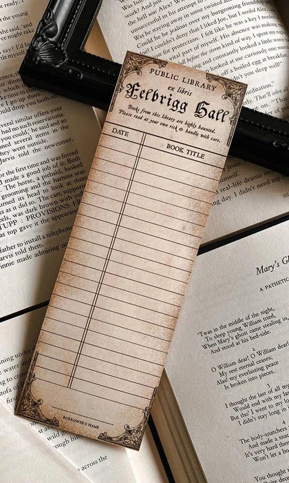 Vintage Haunted Library Card Bookmark inspired by vintage library cards and the real haunted library at Felbrigg Hall, England. Featuring writable material so you can keep track of all of your books as you read them! We recommend using a fine point sharpie or ballpoint pen for the Vintage Library Card Bookmark, or any pen you love that you know won’t smudge!