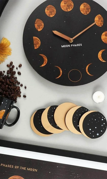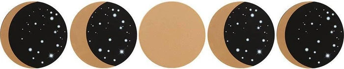 This set of 5 coasters represent the moon phases when aligned. Made in contrasting colours of natural wood painted with black to represent the night sky, dotted with stars.