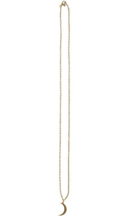 A mystical gold-tone crescent moon necklace beautifully presented on a matching greeting card perfect for gifting.