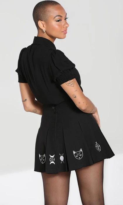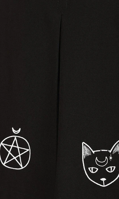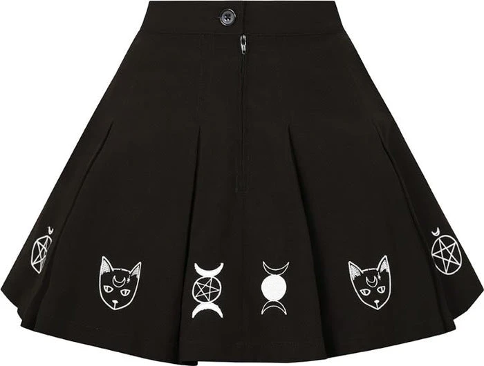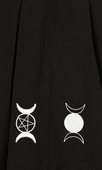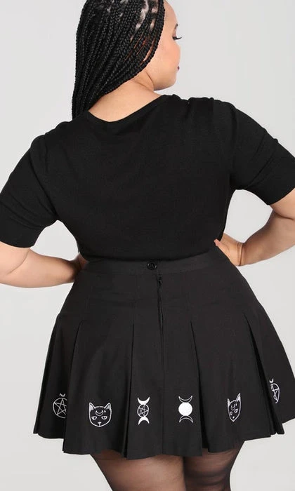 Add some subtle spook to your wardrobe with the Dawn Mini Skirt. The black pleated mini skirt adds a witchy vibe with the white embroidery on each pleat. Style with a black top or a some thigh high stockings for that ‘goth school chic’ look.