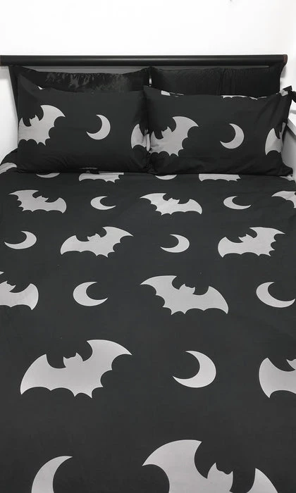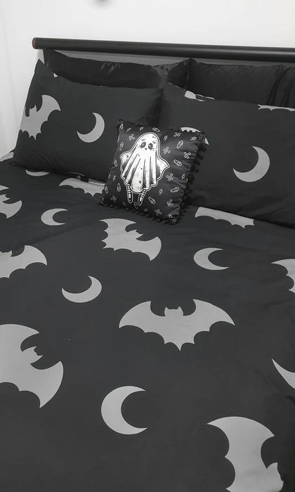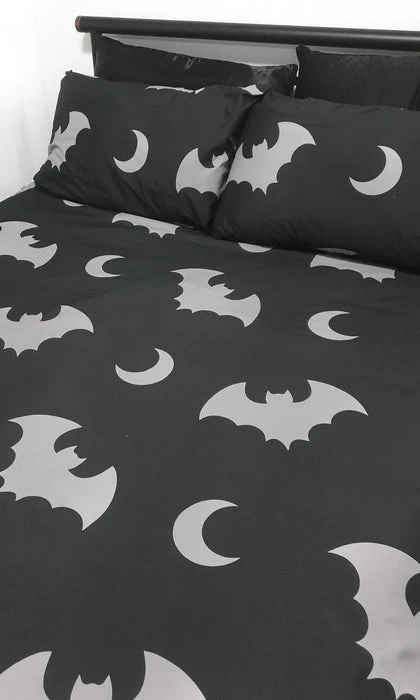 The Creature of the Night Quilt Set brings spooky and macabre vibes to the bedroom. Featuring an all over Bat and Crescent Moon design – perfect for anybody who likes to doze on the deadly side!