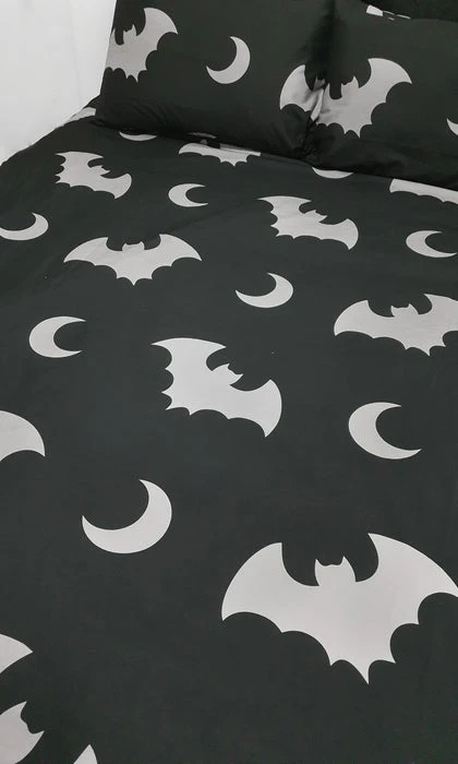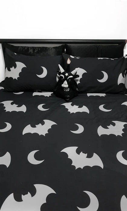 The Creature of the Night Quilt Set brings spooky and macabre vibes to the bedroom. Featuring an all over Bat and Crescent Moon design – perfect for anybody who likes to doze on the deadly side!