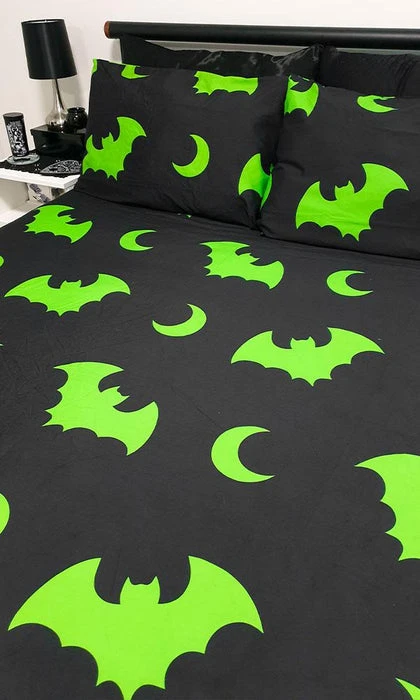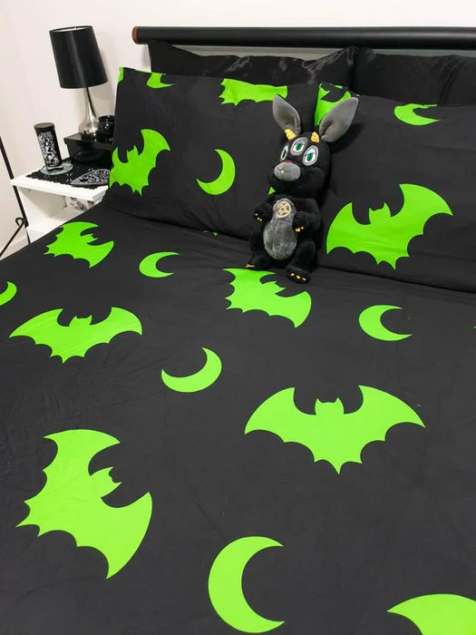 The Creature of the Night Quilt Set brings spooky and macabre vibes to the bedroom. Featuring an all over Bat and Crescent Moon design – perfect for anybody who likes to doze on the deadly side!