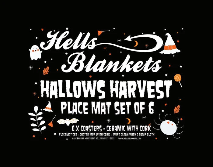 Introducing the Hallows Harvest Placemat Set from the spine-chilling label Hells Blankets, a set of placemats that will add a spooky touch to your Halloween dinner party.