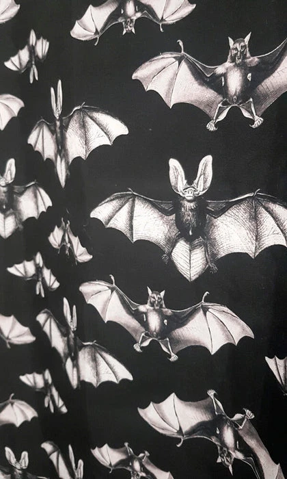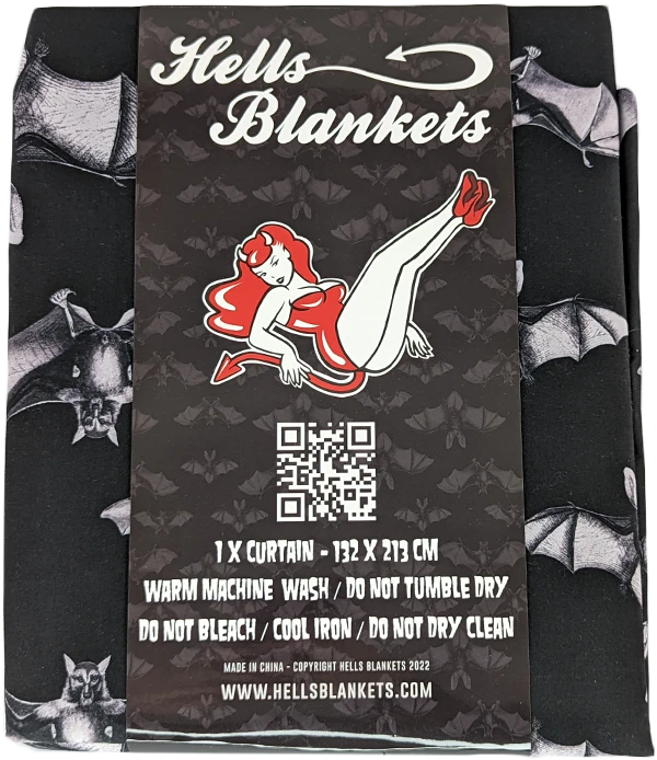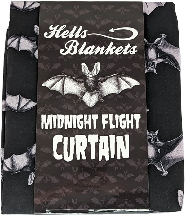 Take flight with Hells’ Blankets Midnight Flight curtain! Featuring a charcoal black curtain with the cutest grey realistic bats all over the place! Perfect to spookify your crypt, bedroom or anywhere your dark heart desires!