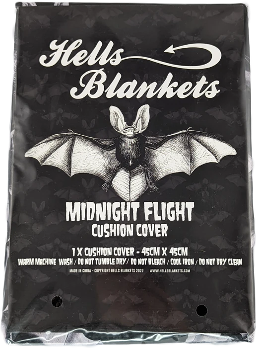 Take flight with Hells’ Blankets Midnight Flight cushion cover! Featuring charcoal black with the cutest grey realistic bats all over the place, this piece will be sure look so cute and be so cozy! Perfect to spookify your crypt, bedroom or anywhere your dark heart desires!