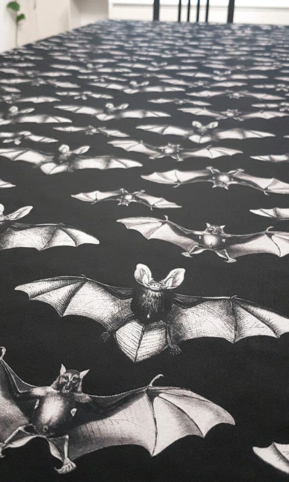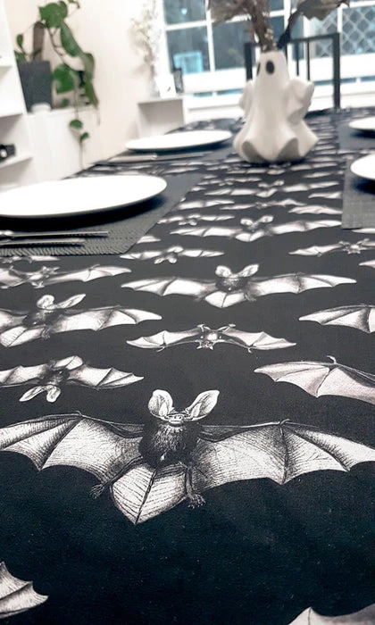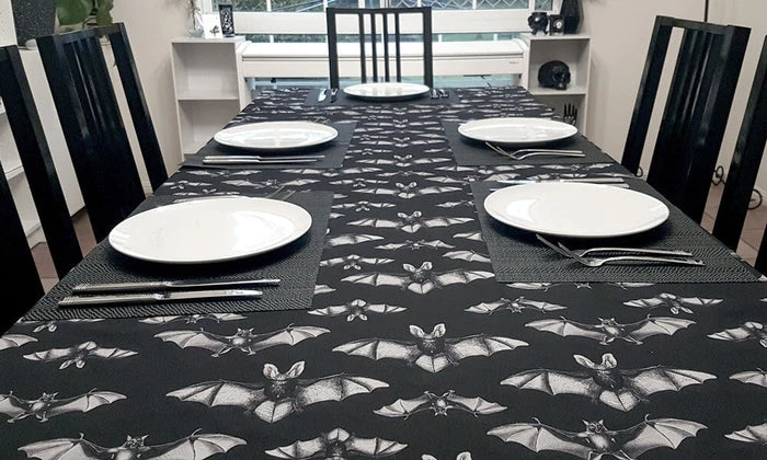 Take flight with Hells’ Blankets Midnight Flight table cloth! Featuring a charcoal black table cloth with the cutest grey realistic bats all over the place! Perfect to spookify your crypt, living/dining room or anywhere your dark heart desires!