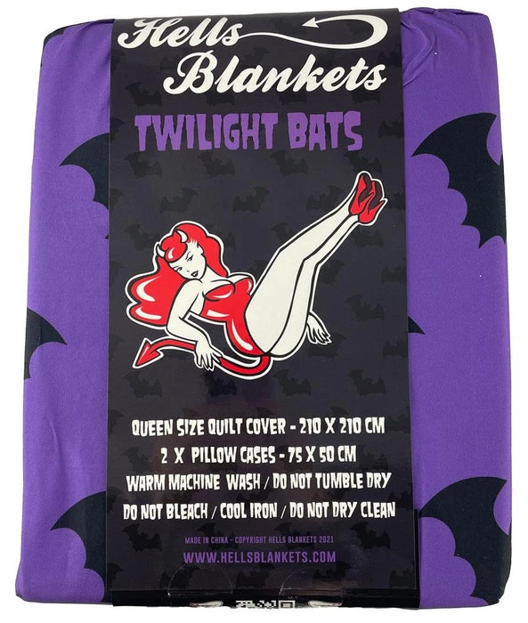 The Twilight Bats Quilt Set brings spooky and macabre vibes to the bedroom. Featuring an all over Bat design on a pastel purple background – perfect for anybody who likes to doze on the deadly side!