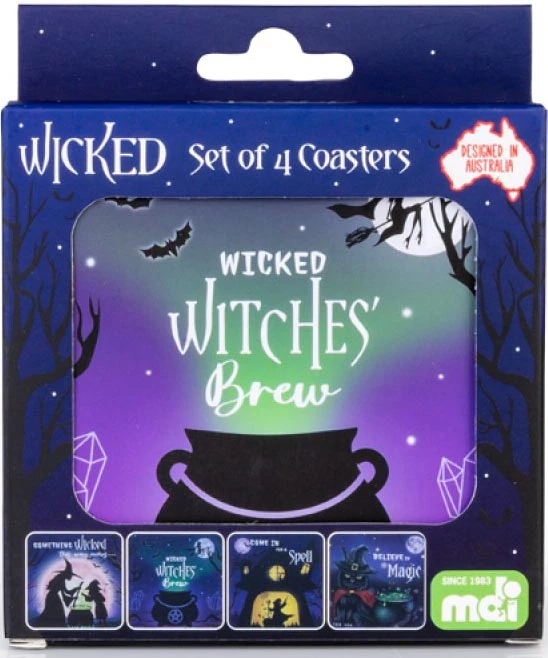 Features magical motifs including bubbling cauldrons, witches and a wise black cat