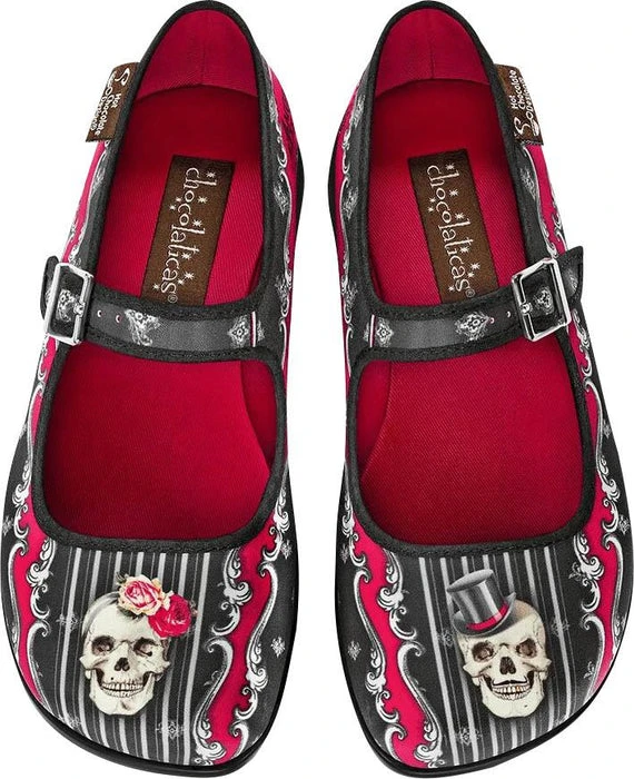 Together forever, our beautifully edgy bride and groom skulls grace the toes of these striking black and red stunners!
