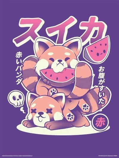 Watermelon is just so good that even red pandas fight over it! This purple print features red pandas in a defeated pile with the victor on top eating a yummy slice of watermelon.