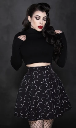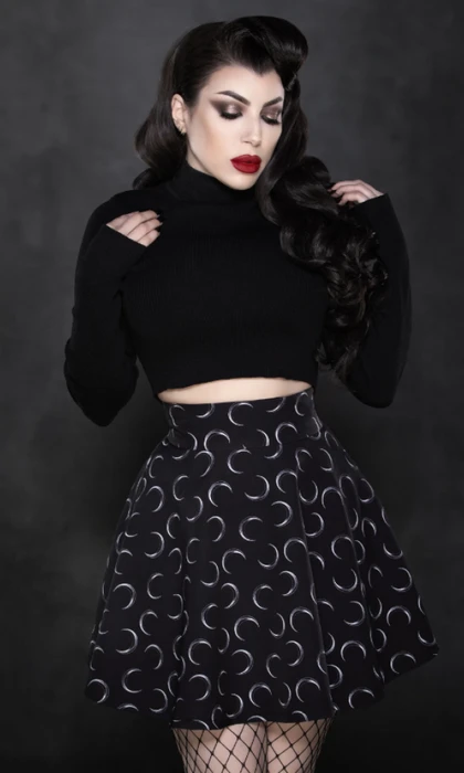 Uncover a new side of your style with the Just a Phaze Skater Skirt. Custom-printed with crescent moons, this skirt delivers an instant dose of drama. With a forgiving stretch and a convenient back zipper, this piece sits high on the waist to accentuate the body shape without compromising comfort.