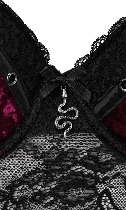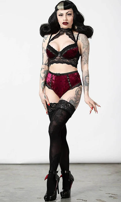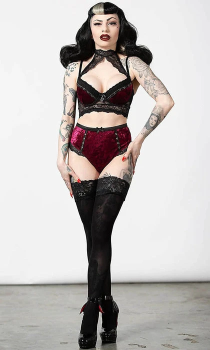 Make them beg for your attention in the ‘Mercy’ bra. Crafted in soft luxe velvet with lightly padded cups and adjustable, elastic straps for the perfect fit. Metal rivet details, snake charm and lace collar detail this bra is perfect for play dates with the devil, dancing barefoot under the moon or a coven sleepover.