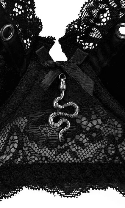 Turn pain into power and seduce in the ‘Sacred spirits’ velvet bralet. Crafted in soft, velvet fabric with delicate lace trim it’s finished with a metal snake charm. Perfect for seducing the demons or making yourself feel fierce.