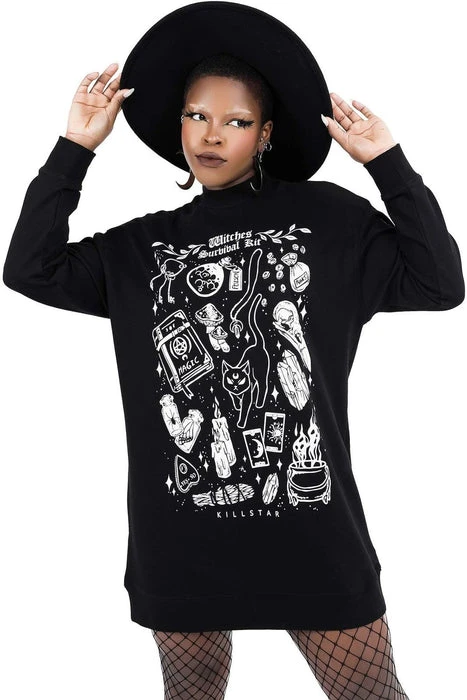 Wanna howl to the moon and back? The Survival Kit extra long sweater in a soft cotton jersey features a round neckline, ribbed cuffs, and printed graphic. The long length makes it super versatile; wear over leggings/ jeans or on its own as a dress!