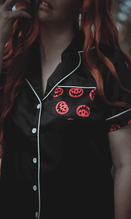 Front: Black + Haunted Hallows repeating fabric. Top ~ oversized button-up bodice, accented with a patch pocket.