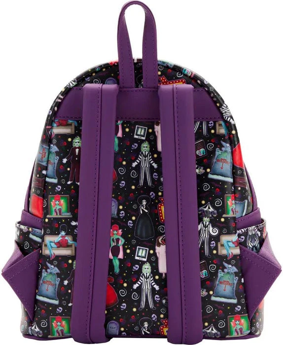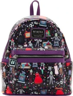 The ghost with the most is on the job! Take a terrifically terrifying trip through the afterlife with this Loungefly Beetlejuice Icons All-Over-Print Mini Backpack. You’ll have a lot of fun packing for an otherworldly adventure with this accessory, which features Beetlejuice, Lydia, Barbara and Adam Maitland, Miss Argentina, and the Magician’s Assistant, all nestled among a swirling motif of Sandworms, Beetlejuice signs, gravestones, and skulls. An enamel zipper charm of the “No Feet” ghosts Polaroid™ tops off the look. It’s the perfect accessory for packing just what you need for staying a few hours with the Deetz family in Winter River, Connecticut—or for stowing away snacks for a long wait.