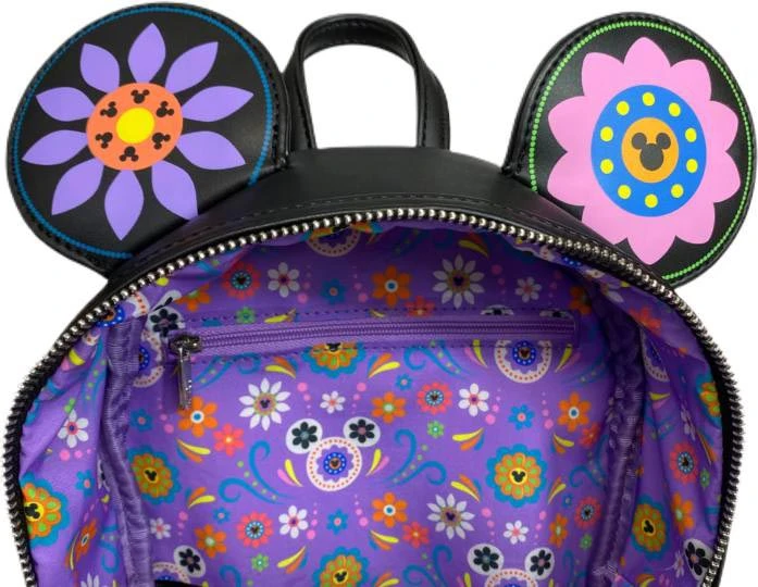 This beautiful backpack bursts to life with vibrant colors and intricate details! Minnie is depicted as a sugar skull, inspired by traditional Mexican art. Her applique ears and hair bow rise above the bag while her face peeks out over the front zipper compartment, which is dressed to impress in a frock with real lace! Meanwhile, gorgeous embroidered and printed details flourish the bag in an array of color, perfectly tying together Dia de los Muertos and Disney in one celebratory design. Celebrate Dia de los Muertos any day of the year with this vibrant backpack!