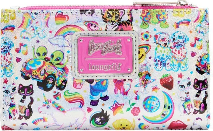 “You gotta have it!” Add a splash of color to your wardrobe with the Loungefly Lisa Frank Iridescent Flap Wallet. This bifold wallet displays an all-over print of some of Lisa Frank’s most popular designs. Much like the stickers and stationery of the 80s and 90s, this item features a bold and bright pattern against a shiny silver iridescent background. Look around and you will find characters such as Panda Painter, Angel Kitty, Markie the unicorn, and more. With 7 slots for holding cards and a clear slot to hold your ID, this nostalgic accessory will keep your belongings safe and accessible wherever you go. This wallet is an officially licensed Lisa Frank product.