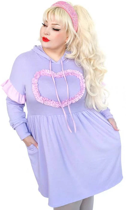 Ultra soft lavender hoodie dress with pockets and a soft pink ruffle heart on front!