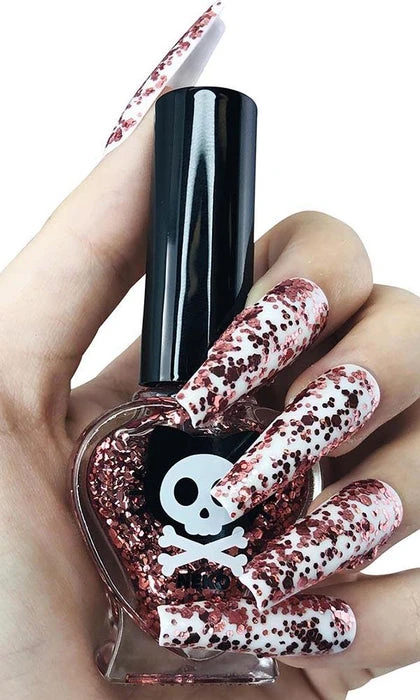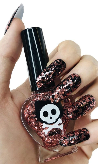 Tip: Glitter based polishes look best when painted over a darker coloured base polish! Take a look at the images above for style examples! (Please Note: The images show this glitter polish painted over the top of a black nail polish). Always start off with a Base coat to prep the nails, shake the Neko Nail Cult bottle well, apply 2 coats and finish off with a clear Top Coat for the best results!