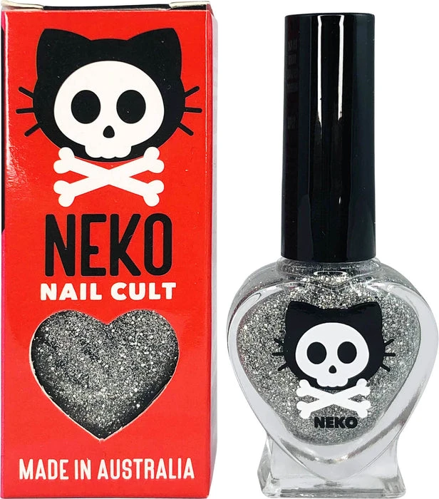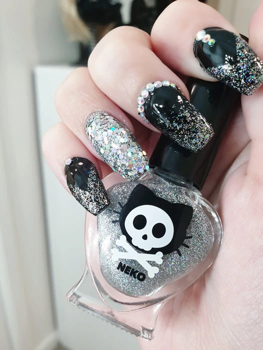 Tip: Glitter based polishes look best when painted over a darker coloured base polish! Take a look at the images above for style examples! (Please Note: The images show this glitter polish painted over the top of a black nail polish). Always start off with a Base coat to prep the nails, shake the Neko Nail Cult bottle well, apply 2 coats and finish off with a clear Top Coat for the best results!