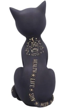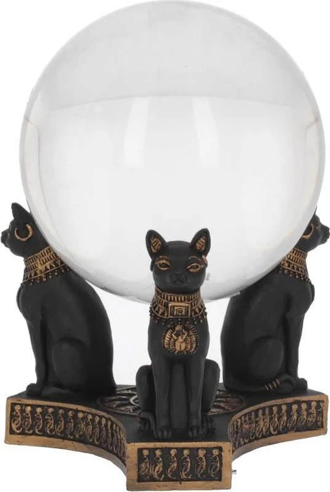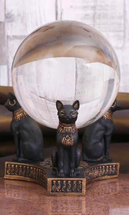 Show your loyalty to the Egyptian Gods of old with this Crystal Ball Holder. Honouring Bastet, the Egyptian goddess of the home, domesticity, women’s secrets, cats, fertility, and childbirth, three cats sits back to back. Complete with gold detailing and winged Scarab’s emblazoned on their chests, this piece is cast in the finest resin before being hand painted.