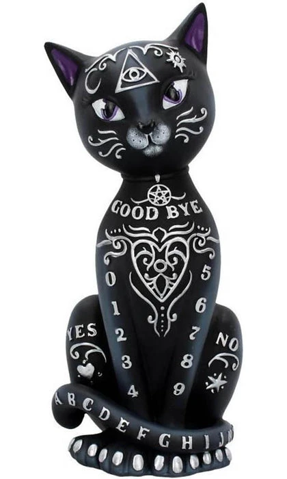 Walk and talk between worlds with the Mystic Kitty. Sitting up, this black cat looks at you inquisitively, large purple eyes portraying a preternatural intelligence. Silver letters and numbers cover their fur, mimicking a spirit board – the numbers 0 to 9 are down their front legs, “Yes” and “No” are written on their knees, and the letters of the alphabet start at the tip of their tail and continue up their back. A baroque heart-shaped planchette design is repeated on their front and their back, and the word “Goodbye” appears below the silver pentacle hanging from their collar. A pyramid with an eye in it is picked out on their forehead. Cast in the highest quality resin before being carefully hand-painted, this mysterious feline can add an air of magic to any home.