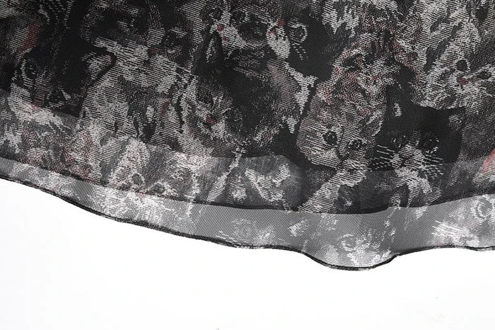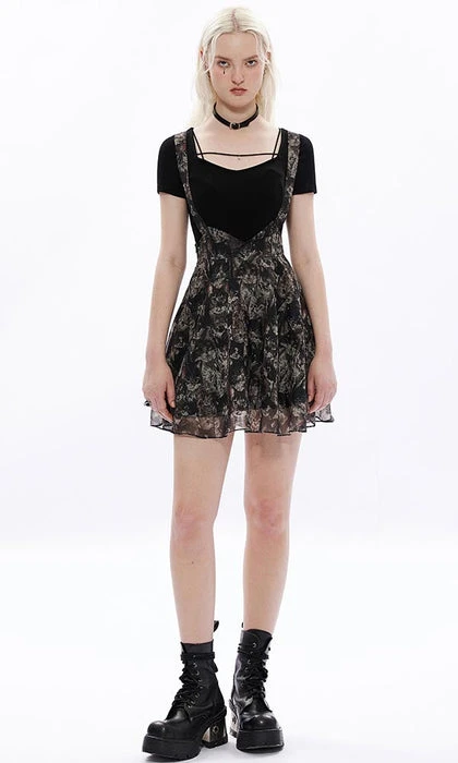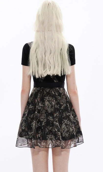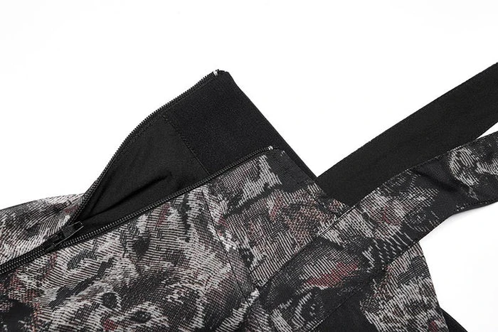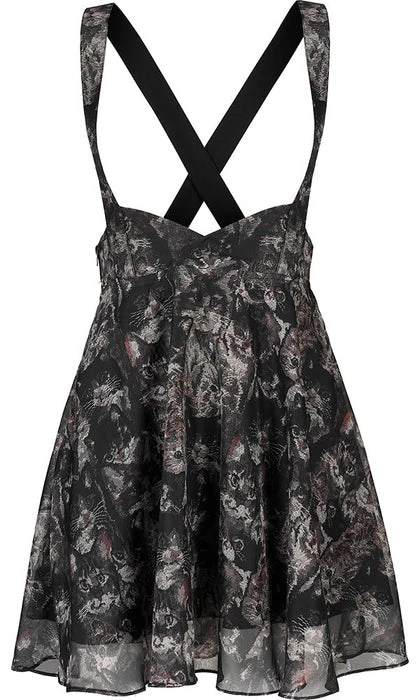 This cute and playful pinafore style skirt is the perfect addition to your summer wardrobe. The skirt hem is made of chiffon gauze, which is light and fluffy and has a adorable but subtle cat print. Pair it with a black or white tight fitted shirt and your go to goth boots.