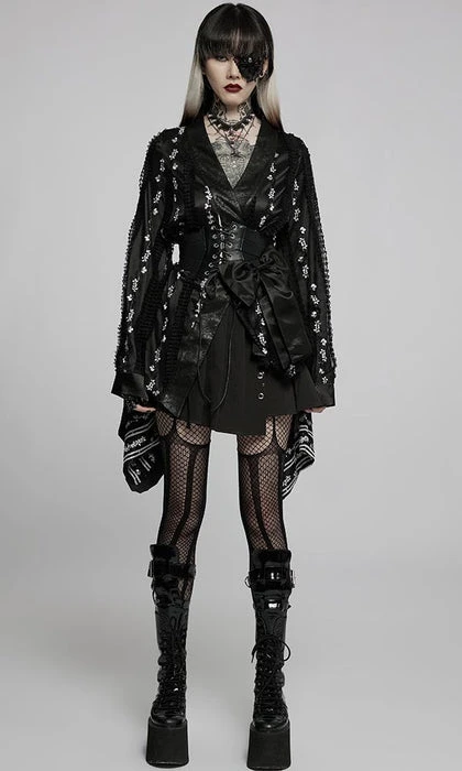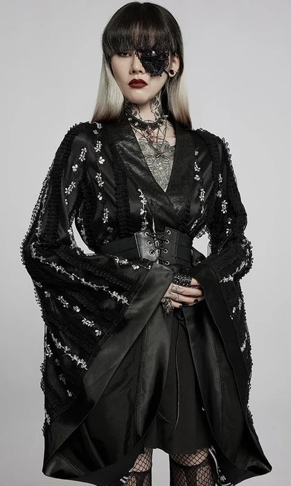 Wander and capture the hearts of those around in this exquisite kimono. The large black bow can be used as headwear or as decoration on the coat to enrich the outfit. This beautiful kimono will look incredible with some fishnets and combat boots!