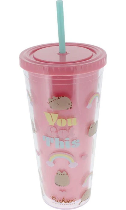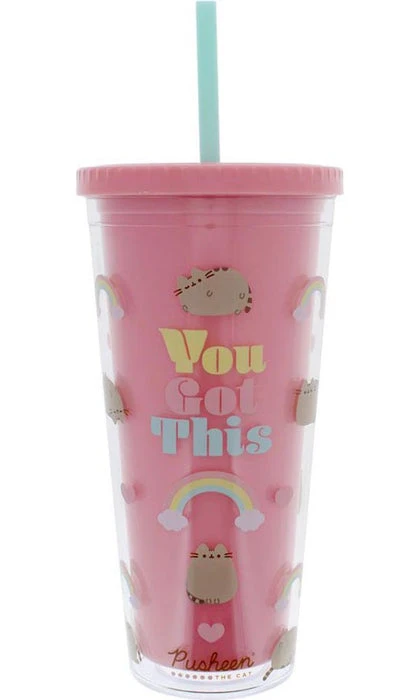 Sip your favourite cold beverage in style with this adorable and quirky Pusheen Beaker & Straw Set. Caption reads ‘You got this’ with cute illustrations of Pusheen in various poses, and also rainbows and hearts. Perfect gift for a Pusheen fan or cat lover!