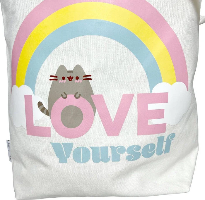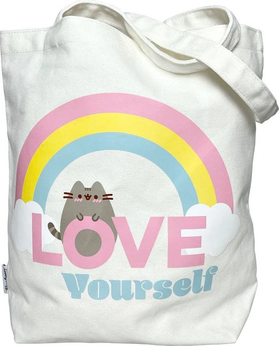 This adorable Pusheen tote bag is perfect for carrying all your essentials with you to school or it can also be used as a shopping bag. Caption reads ‘Love yourself’ with a cute illustration of Pusheen underneath a rainbow. Perfect for any cat lovers!