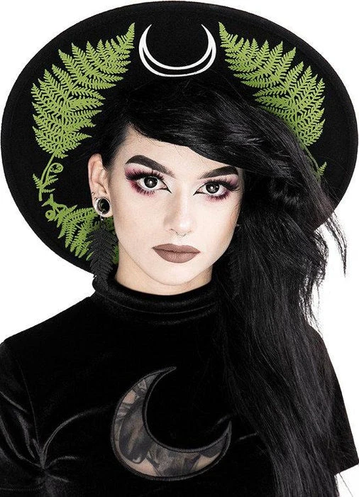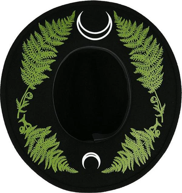 Forest Witch Hat that goes oh so perfectly with the Forest Witch Hoodie! This magical circular brimmed headpiece is entirely firmed so it keeps the shape perfectly. Featuring fern leaves and crescent moons on the underside of the brim, this will transform any outfit to an edgy witchy look.