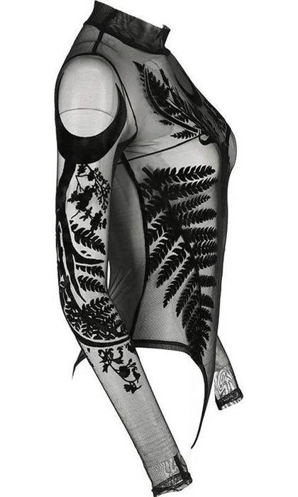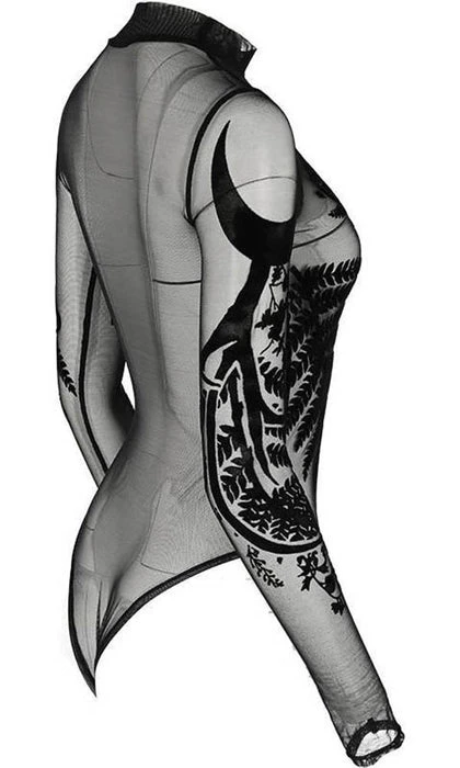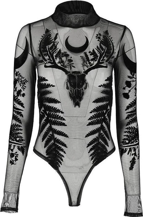 Incredible Gothic Ferns, and Antlers adorn this Black Mesh Bodysuit. The flocked velvet is soft to the touch and the sheer material is elegant and mystical! Featuring a clasp at the bottom, long sleeves and a high neck, this bodysuit looks incredible paired with high waisted pants or a skirt and a dark under top.