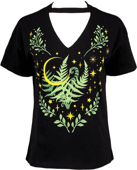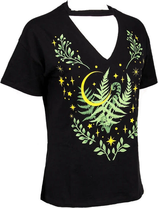 Witches, goths, sorceresses – you will all love the Herbal V-neck choker T-shirt. This shirt spices up your normal wardrobe with the V neck cutout and the choker look. Pair this top with a pair of jeans and some stomping boots for a cute cottage goth outfit.
