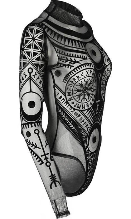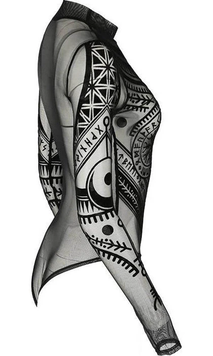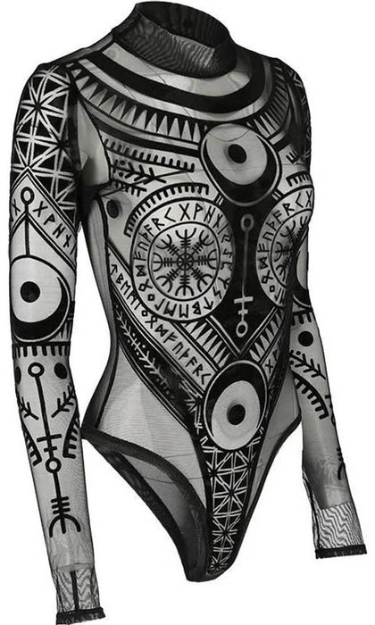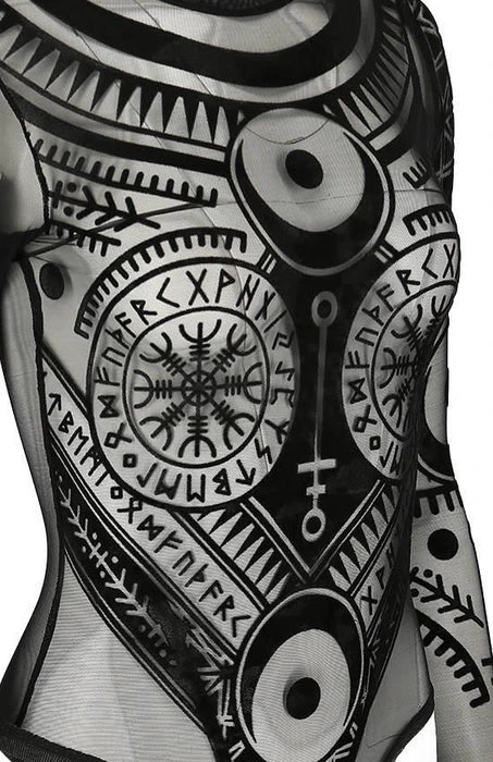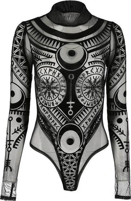 Incredible Elder Futhark Runes, Lunar and Geometric Motifs adorn this Black Mesh Bodysuit. The flocked velvet is soft to the touch and the sheer material is elegant and mystical! Featuring a clasp at the bottom, long sleeves and a high neck, this bodysuit looks incredible paired with high waisted pants or a skirt and a dark under top.