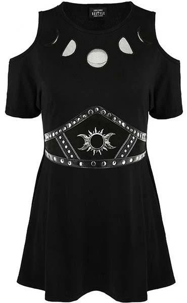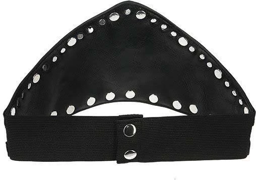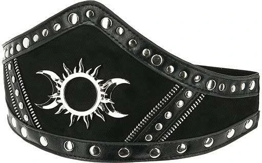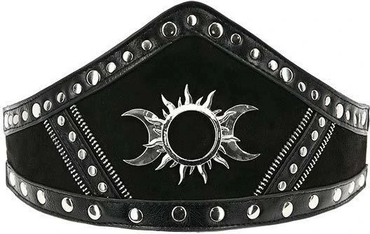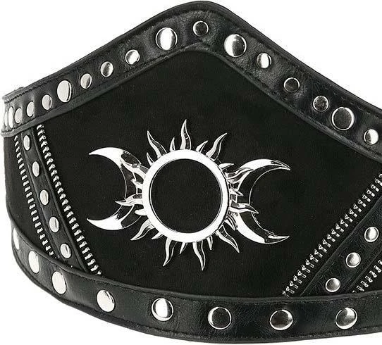 We present an elegant take on the waist belt with this PU leather-trimmed gothic design. This Goth waist belt has been crafted from faux suede and decorated with a contrasting Pu leather details. Triple Goddess Motif and rivet hardware stands out against the black background. The style has an adjustable strap that fastens around the waist, closes on the back with a snap detail. Let yours cinch a billowing black dress or a pencil skirt for a magical look!