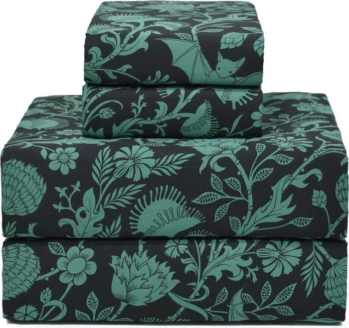 Bring your love of a moonlight stroll into your bedroom with Elysian Fields in a new shade: Absinthe green. Frisky little bats flutter among the graceful thistles and Venus flytraps on these dreamy sheets made from long staple cotton. Spruce up your bed with floral linens that are far from the usual. Just like you.
